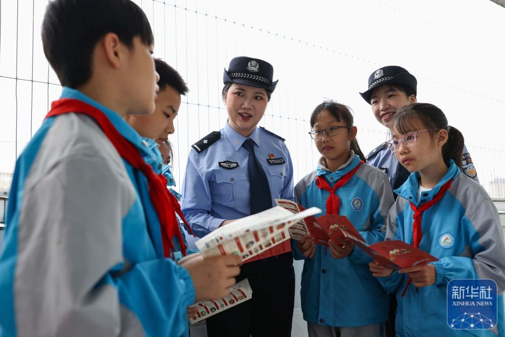 ↑ 4月14日,在贵州省铜仁市玉屏侗族自治县第四小学,民警给学生讲解国家安全知识。新华社发(胡攀学摄)